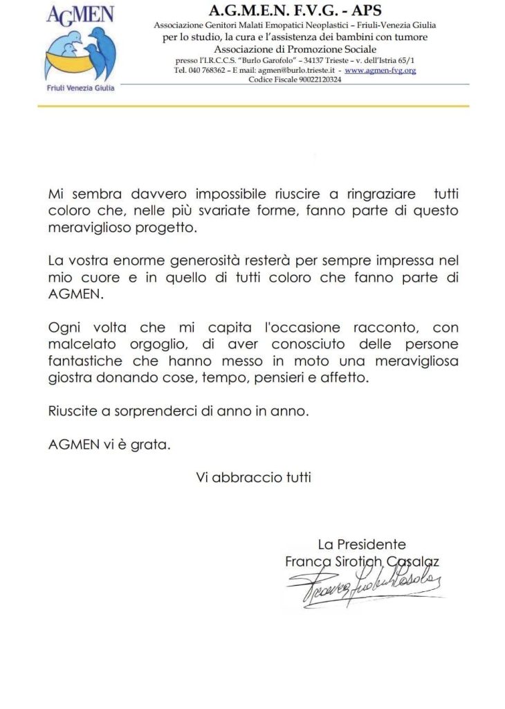 a beneficio di AGMEN FVG per il Reparto di Oncoematologia dell’Ospediale Pediatrico “Burlo Garofolo” di Trieste.